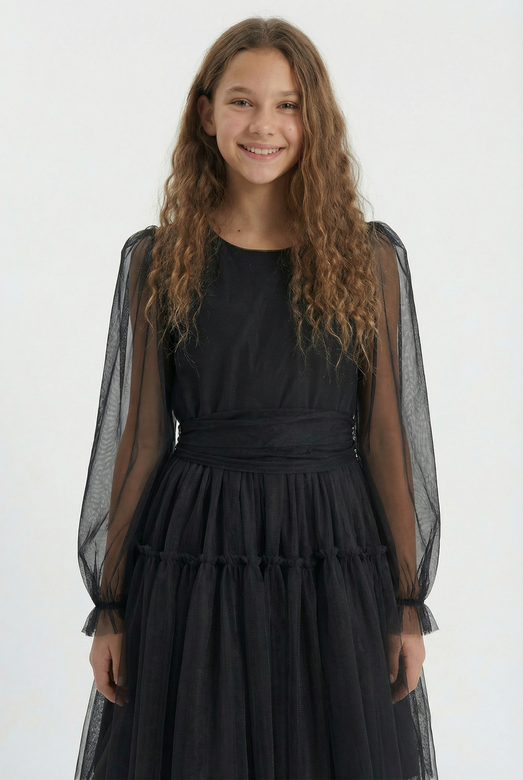 De Holly-jurk is een meesterwerk van hedendaagse kindermode. Deze prachtige zwarte tulejurk combineert de warmte van lange mouwen met de luchtige elegantie van een tulen rok, waardoor een look ontstaat die zowel verfijnd als comfortabel is. Ideaal voor de herfst- en wintermaanden, wanneer uw dochter er stralend uit wil zien zonder het warm te hebben.